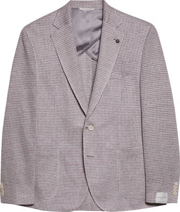 A slim-fit two-button sportcoat knit from a smooth linen blend and decked in classic houndstooth checks evokes a quintessential mid-century look that remains cool and stylish to this day.