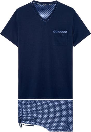 The Hampton Short Pajama Set captures the relaxed summer elegance of the Hamptons. Made from a blend of cotton and modal, they offer unrivalled softness, lightness and breathability. Their micro geometric print in shades of blue evokes the refined aura of the American East Coast. This two-piece set consists of a V-neck T-shirt with contrasting piping and an embroidered patch pocket, and flowing shorts that ensure total freedom of movement.