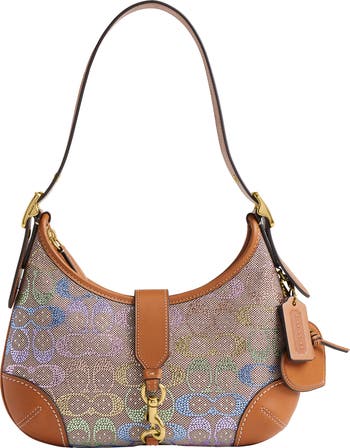 Crystals illuminate the signature jacquard exterior of a structured shoulder bag designed in a slender profile and fitted with an adjustable strap for versatile wear.