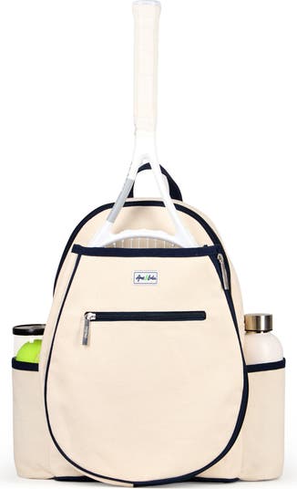 - Canvas I Adjustable shoulder straps with two color webbing I Zip Closure I Exterior pocket fits two racquets I Exterior front zip pocket I Interior zip pocket I Two interior slip pockets I Two exterior water bottle pockets I Nylon liner I Protective metal feet on base.