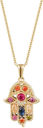 A hamsa pendant set with multihued crystals sparkles and shines on this elegant chain necklace.