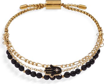 Wear symbols of protection with this Stranded Hamsa Bracelet Set, which features three bracelet strands. One has an in-line charm with a buffed epoxy hamsa hand with cubic zirconia accents on a chain bracelet, one is a chain link bracelet, and one has semi-precious Black Onyx beads, believed to help center and balance the wearer. The Stranded Collection features an all new, interchangeable design. Bracelet strands attach to an adjustable-length keeper, included with the set. Swap out strands from different pieces and combine them to make a style that’s all your own.