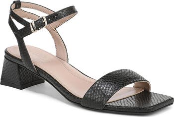 Stroll the boardwalk or dance the night away in this soft suede or leather ankle-strap sandal framed by a squared open toe and wrapped block heel.