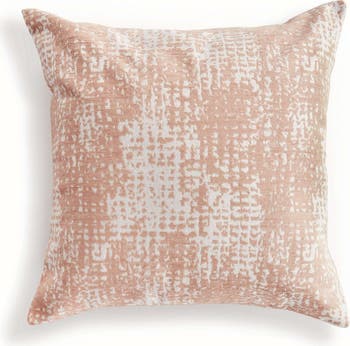 The indoor pillow that lives beautifully outdoors. Enjoy the upscale luxury and durability of Jacquard. With a woven blush and white pattern, it plays well with any palette. This pillow is weather resistant and responsibly made. Filled with 100% recycled fibers.