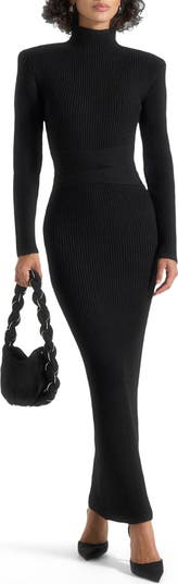 This midaxi-length dress is crafted from heavyweight knit fabric, offering both warmth and structure for an elevated finish. The halter neckline introduces a sleek, modern edge, balanced by subtle shoulder pads that define and sculpt the silhouette. A knit tie-waist belt allows for adjustable styling, cinching the waist for a refined shape, while the elongated midaxi cut delivers effortless sophistication.