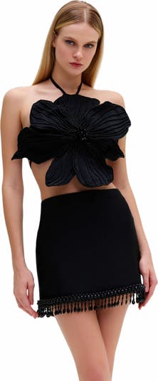 Due to the intricately hand-beaded hand-sewn and hand-dyed appliqué flower bodice this top takes two days to make. It features a double back tie closure built-in boning and an adjustable halter-neck tie. Model is wearing a size small. Made in Brazil85% polyamide 15% elastane. TOP27105US.