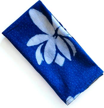 These napkins are block printed by hand using a carved wooden block on handwoven organic cotton fabric. Featuring a dotted background and a modern lotus design, they are dyed in natural indigo bath to create a timeless addition to your table. Lotus symbolizes many things but ones that we were inspired by here were its representation of healing and rebirth. Perfect for casual meals or special gatherings. • hand-block printed using a wooden carved block • hand dyed in Natural Dyes • color - indigo, white • fabric - organic cotton • size - 19" x 19" • set of 4 *Please note that slight color variations may occur, as each piece absorbs natural dyes differently—a beautiful part of the handmade process. --------------------------------------- ABOUT BLOCK PRINTING Block Printing is an ancient printing technique especially with the use of vegetable dyes. After the wooden block is carved with the pattern, the fabric is then prepared with multiple washes to make the fiber ready to take the dye. With the process of multiple printings and washing before the final product is placed in a dye bath of flowers and barks, the fabric goes through the hands of the block printer and dyer with utmost care. That same care is passed onto the consumer who wishes to take part in this process of honoring the craft and the earth that gives us so much.