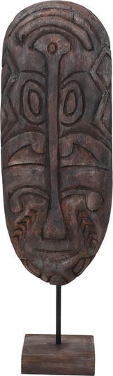 - This strikingly contemporary sculpture showcases a decorative hand-carved mask atop a sleek iron and wood stand