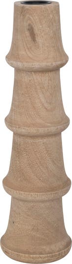 - Hand-carved mango wood taper candle holder in a natural finish