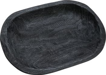 - This shallow bowl has a smooth, matte black finish that accentuates the natural grain and texture of the wood.