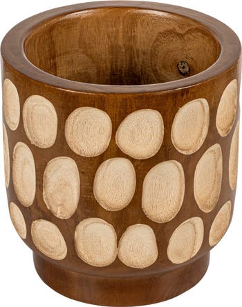 Enhance your space with the rustic elegance of this Hand-Carved Wood Planter with Dots, finished in a rich walnut tone. Featuring a unique dot pattern, meticulously carved by hand, this planter showcases artisanal craftsmanship and attention to detail. Perfect for displaying small plants or succulents, this piece adds a natural yet stylish touch to your décor.