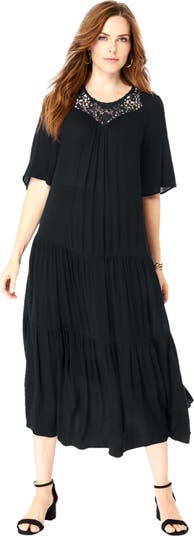 Whether you are off to a concert, shopping, or meeting up with friends, make a day of it in this dress with its tiered skirt. It's easy, lightweight and beautifully drapes your shape. Flutter sleeves and a crochet yoke top add a touch of delicate detail and charm.