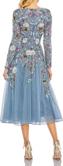 Hand Embellished Floral V Neck Long Sleeve Dress