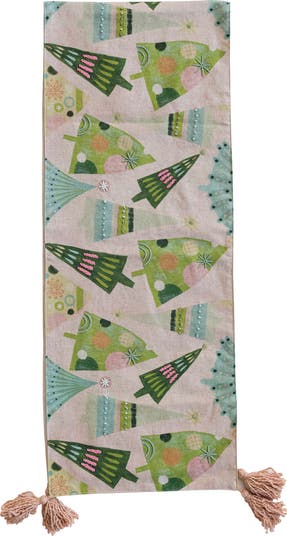 - A hand-embroidered cotton printed table runner with a festive Christmas trees pattern, embellished with beads, French knots and tassels in multicolor