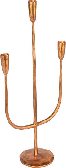 - An exquisite hand-forged metal candelabra, cloaked in a copper finish, designed to hold three standard wax or LED taper candles