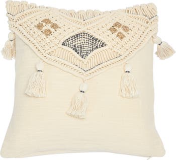 - This textural, boho-inspired throw pillow showcases hand-woven construction with intricate cotton and jute macramé detail, finished with decorative tassels