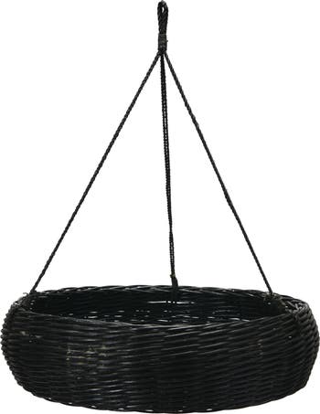 - Hand-woven hanging rattan planter and jute rope in black finish