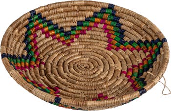 - A beautifully hand-woven round basket featuring a natural seagrass finish with a vibrant multi-colored star design