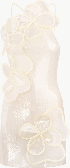 Sequin mini dress with handcrafted layered floral appliques, crafted for a delicate, artisanal finish.