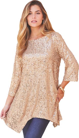 Standout and shine in this bold sequin boatneck tunic with three-quarter length sleeves. Featuring a relaxed silhouette and a handkerchief-hem, this polished yet undeniably fun tunic was made for a night out on the town.