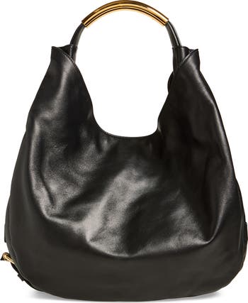 The signature tubular handle and surrounding strap shape this slouchy leather hobo bag boldly branded with gleaming logo hardware extending along the side.