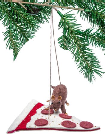 Bring a whimsical touch to your holiday decor with this adorable rat-and-pizza ornament that's handmade by women artisans in Kyrgyzstan from felted wool.