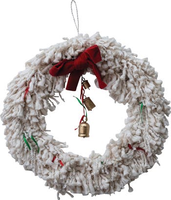 Handmade Cotton Blend Yarn Wreath with Red Bow, Red and Green Ribbons and Metal Bells, ivory