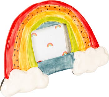 - A vibrant handmade stoneware photo frame in a charming rainbow shape