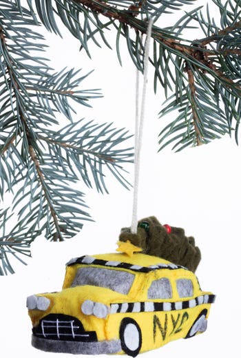 Small in scale yet big on nostalgia, the classic yellow cab rolls into holiday trim with a felted fir lashed to the top and high-contrast checks riding the doors.