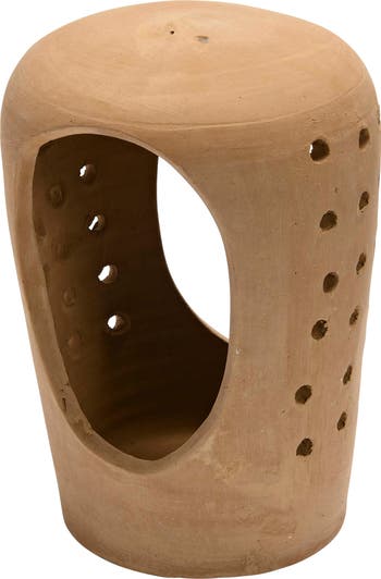 This handmade terracotta candle holder showcases an organic silhouette with cutout designs; 100% Terracotta; 4.75"L x 5.25"W x 8"H