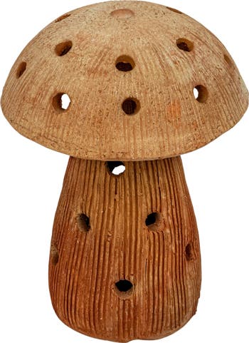 Add some personality and enchantment to the home with this handmade vintage reproduction terra-cotta mushroom shaped candle holder. This lovely piece showcases a handmade vintage reproduction terra-cotta base in a mushroom shape with cut-outs and a natural color that adds a touch of warmth and originality. The candle holder can hold one pillar candle (not included) that will illuminate the space with a soft and inviting glow. The candle holder is made of terra-cotta and paper mâché that are sustainable and durable. Each one will vary slightly due to the handmade nature of the item. Whether used for everyday or special occasions, this candle holder will enhance the decor and mood.