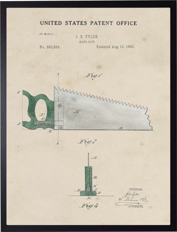This vintage-inspired print, framed in a black wooden frame, features a handsaw patent. Sized at 16 inches by 20 inches, this made in the USA frame makes for a beautiful addition to any wall.