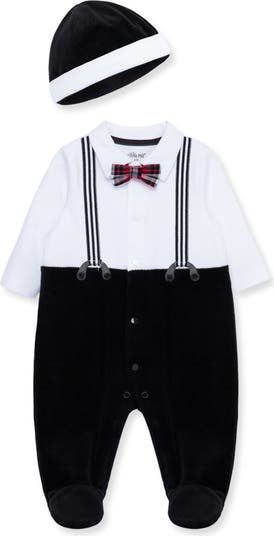 A white shirt, plaid bowtie, striped suspenders and black pants transform a one-piece hoodie and lined hat into a smart outfit for your dapper little one.