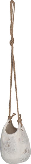 - A stunning stoneware planter with a jute rope hanger and a distressed volcano finish in white