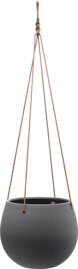 Storied Home Hanging Stoneware Planter with Leather Rope Hanger, Latex Finish, Black, Main, color, Grey