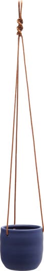 - A charming round stoneware planter with a navy blue finish and leather rope hanger