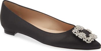 The line's iconic crystal buckle—inspired by a vintage brooch found by Manolo Blahnik—lends sparkling decadence to this almond-toe flat done in luminous satin.