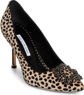 Inspired by the opulence of a French emperor, this almond-toe pump holds court with an animal-print genuine calf hair upper and bejeweled buckle based on one that Manolo Blahnik found in Italy.