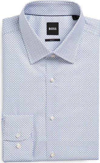 Achieve an effortlessly polished look in this dress shirt cut from a smooth, breathable cotton blend woven with a refined geometric pattern.