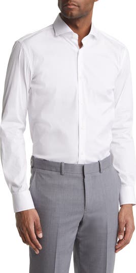 Solid coloring brings easy versatility to this dress shirt crafted from a stretchy cotton blend with a spread collar and fit that works tucked or untucked.