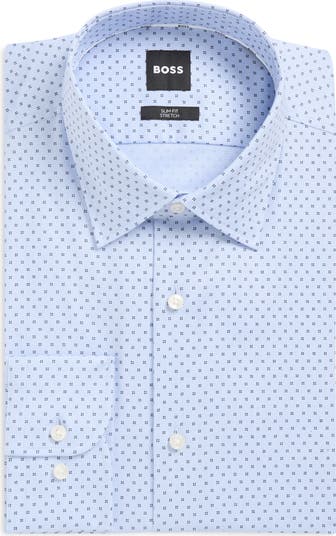 Tailored from crisp cotton and patterned in small, neat geometries, this pale-blue dress shirt features a touch of stretch to keep you moving comfortably day and night. Machine-washable and easy to care for, it makes a smart addition to your semiformal and all-season wardrobes.