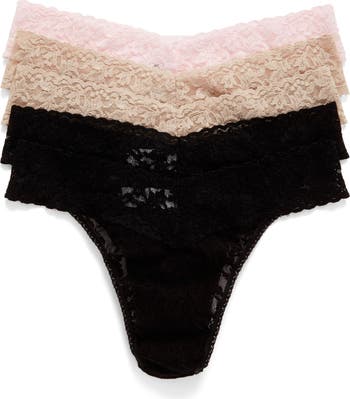 Made from soft and stretchy floral lace, these original-rise thongs are comfortable, cute and keep panty lines at a minimum.
