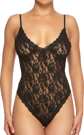 Made from soft and comfy floral stretch lace, this bodysuit has retro high-cut legs and a thong back to work as a foundation or a standalone piece.