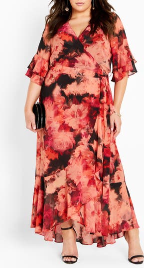 Fluttering sleeves and floaty ruffles enhance the graceful movement of this wrap dress romanced by rich allover blooms.