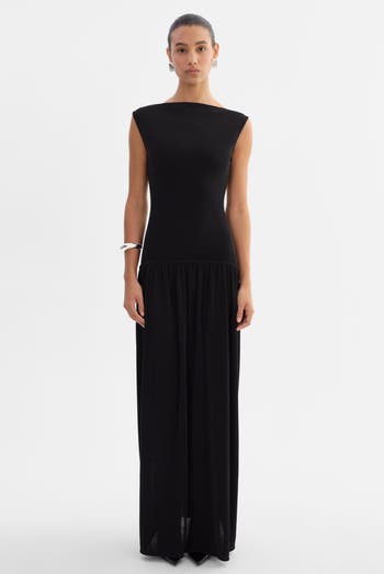 The Hanna Knit Maxi Dress brings understated elegance with its fitted drop waist silhouette and fluid jersey drape. Designed with a sleeveless cut and boat neckline, it features delicate gathering at the hips for soft movement. Perfect for evening occasions, this style transitions seamlessly from dinner to after-hours.
