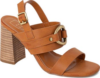 A gleaming O-ring puts a polished spin on this neutral slingback sandal crafted from smooth faux leather and lifted by a stacked block heel.