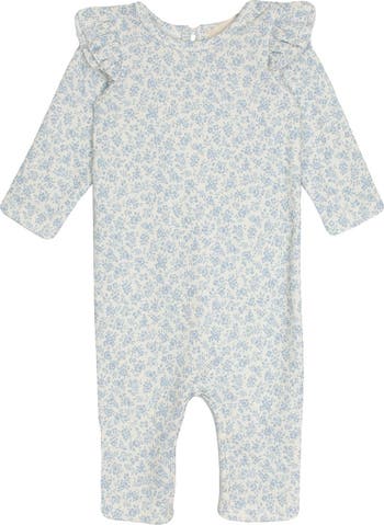 Soft cotton Hannah Romper in light blue by Mabel and Honey. Dainty floral print with ruffle shoulder accents and puff long sleeves for a vintage-inspired look. Lightweight, breathable pullover with a crewneck for easy dressing—ideal for play and naps. Machine wash cold, line dry; do not bleach.