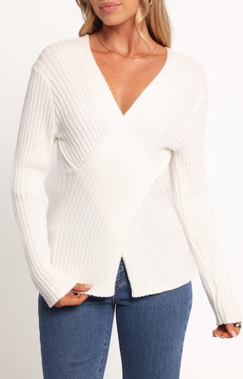 A softly ribbed knit amplifies the cozy feel of this V-neck sweater perfected by a chic crossover front design.