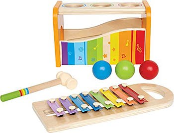Encourage fine motor skill development and problem-solving with a vibrant musical toy featuring multiple options for play with a hammer, balls and a removable xylophone.