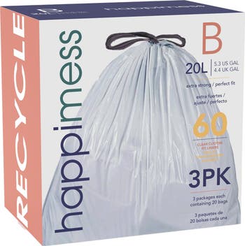 Happimess custom fit, unscented trash bags are tailored to fit our popular 7.9-gallon trash cans, and stay neatly hidden when the lid is closed. The drawstring design makes bag changes quick and easy. Made from tear-resistant, puncture-resistant LDPE plastic that's durable and recyclable.